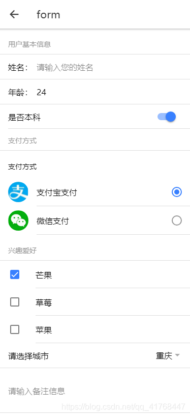 //提前定义好一个数据,用来实现表单的双向数据绑定public peopleInfor:any={username:'',age:24,flag:true,paytype:'1',checkbox:[{ value:'芒果',isChecked:true },{ value:'草莓',isChecked:false },{ value:'苹果',isChecked:false }],citylist:['北京','上海','重庆'],city:'重庆'}