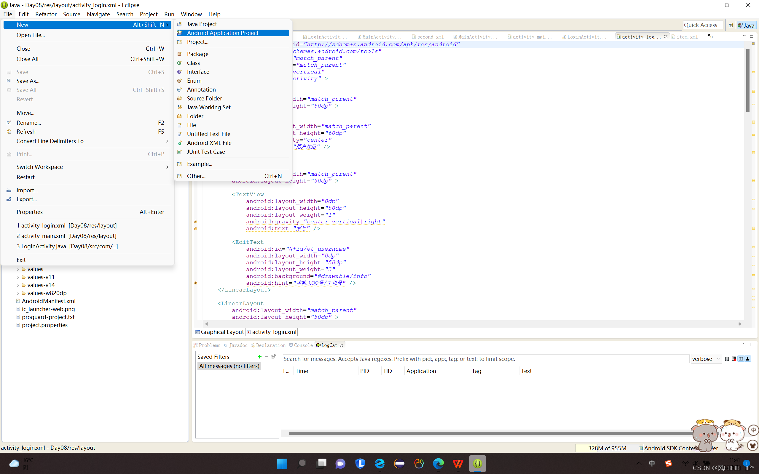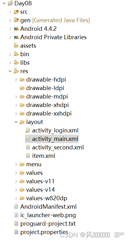 打开我们创建的Day08 找到res-layoutbing并打开activity_main.xml文件(如下图所示)