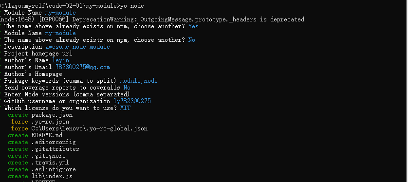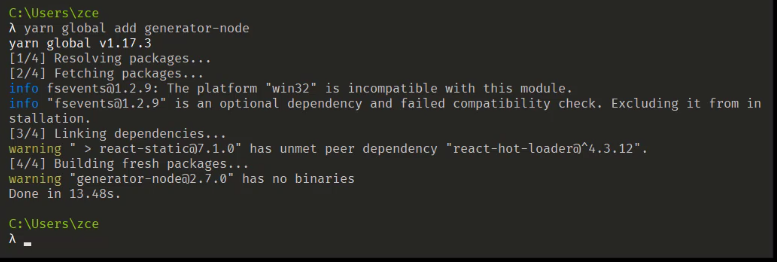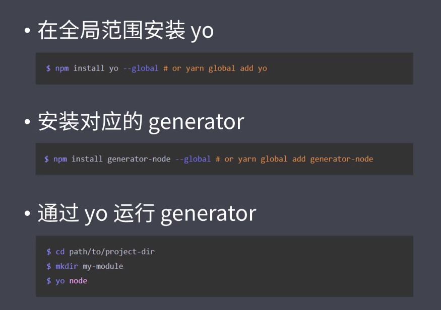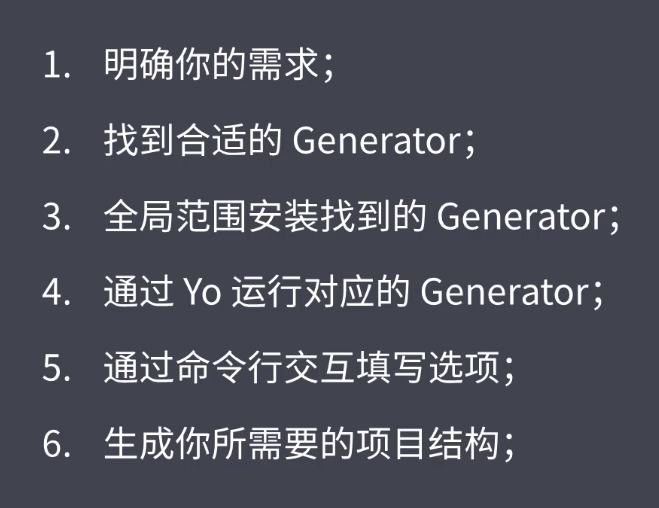 yeoman要去搭配特定的generator去使用,要找到所建对应项目类型的generator,使用generator-node,先全局安装generator:yarn global add generator-node