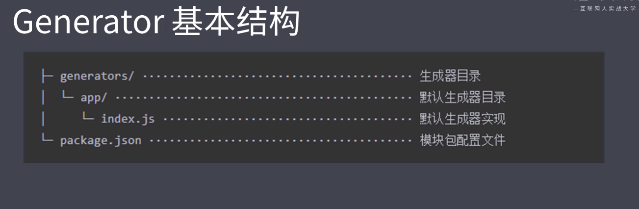 除了特定的结构,还有一个不同的是,yeoman的Generator的模块名称为Generator-