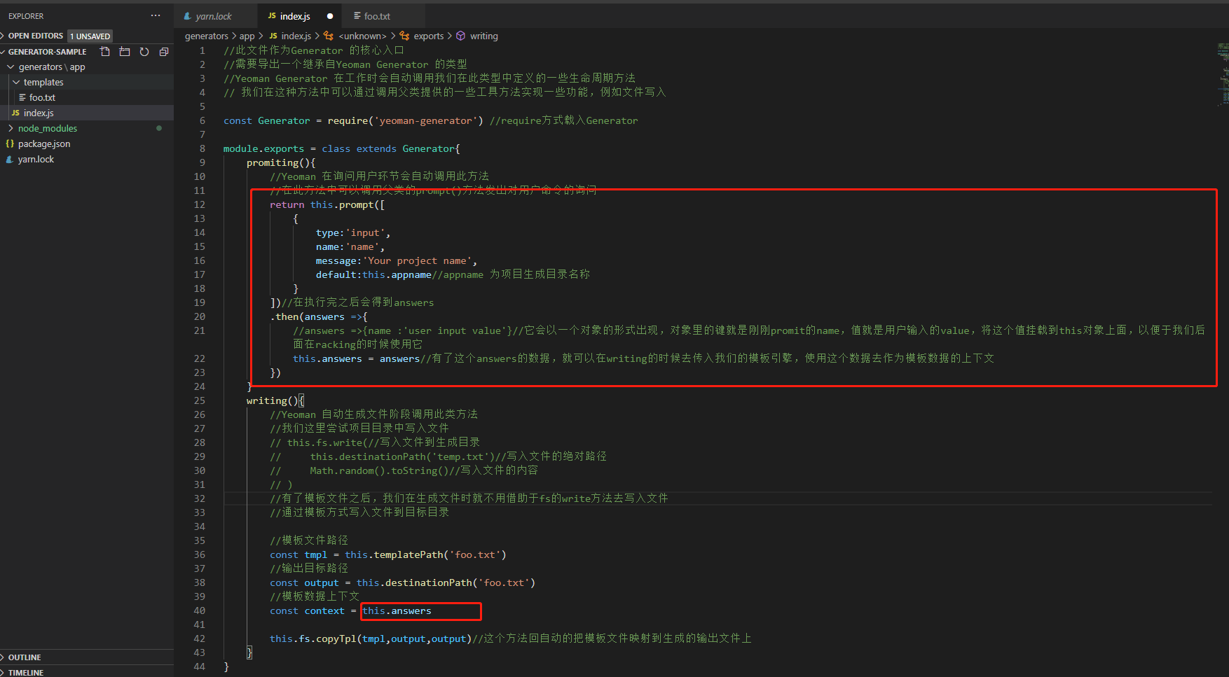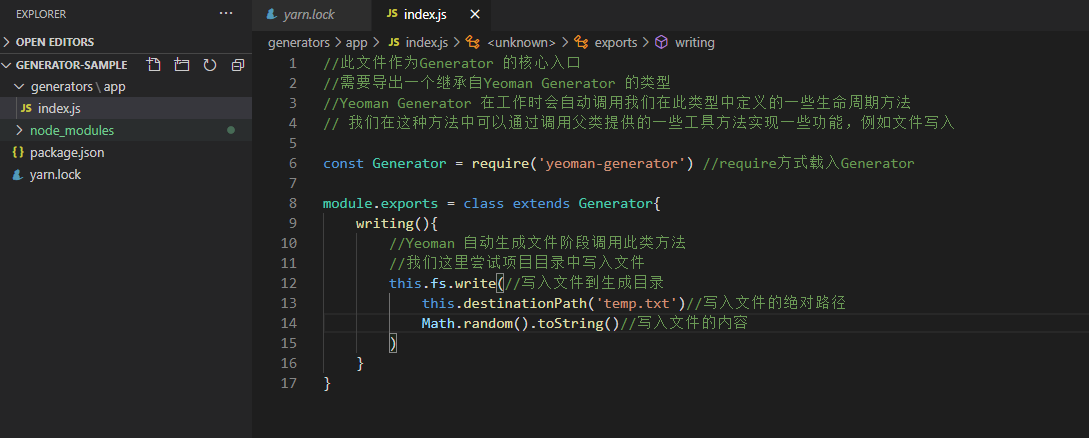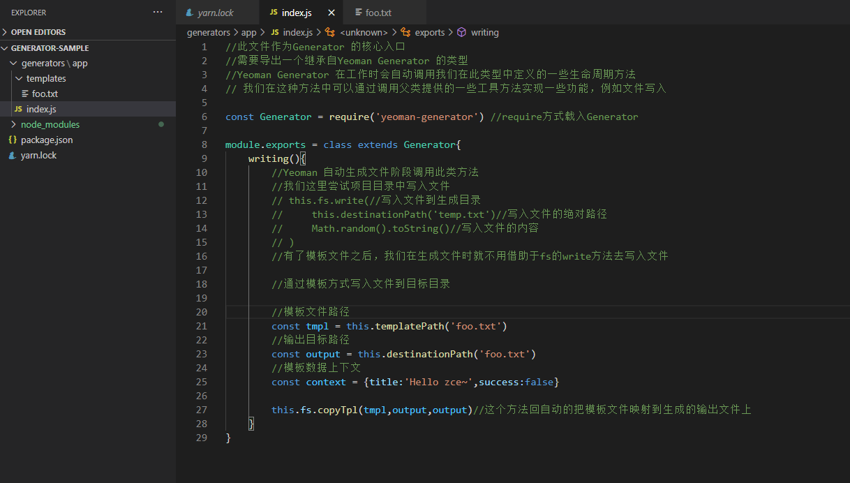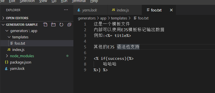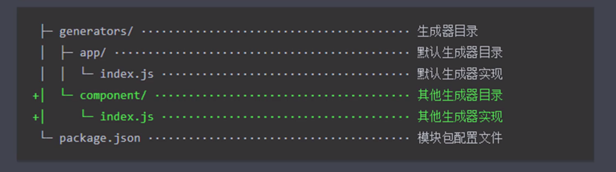 安装yarn-generator的一个模块,这个模块提供了生成器的一个机制,这个机制当中提供了一些工具函数,让我们创建生成器的时候更加便捷