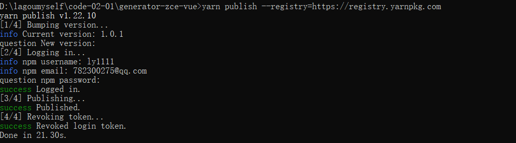 发送到npm后,这个模块就可以在全局范围通过npm或yarn方式去安装,然后再通过yeoman去使用它(yo 这个Generator)。