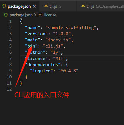 - 新建一个文件夹使用yarn init 初始化,然后再初始化后的package.json里面添加属性bin,设置入口文件,用于指定CLI应用的入口文件