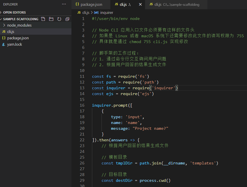 ]).then(answers => {// 根据用户回答的结果生成文件// 模板目录const tmplDir = path.join(__dirname, 'templates')// 目标目录const destDir = process.cwd()// 将模板下的文件全部转化到目标目录fs.readdir(tmplDir, (err, files) => {if (err) throw errfiles.forEach(file => {// 每一个file都是相对于templates下的相对路径// 通过模板引擎渲染文件,这里采用 ejs/*** renderFile() 方法 接收三个参数* 一,文件的绝对路径* 二,渲染的数据* 三,回调函数*/ ejs.renderFile(path.join(tmplDir, file), answers, (err, result) => {if (err) throw err// 将结果写入目标文件路径fs.writeFileSync(path.join(destDir, file), result)})})})