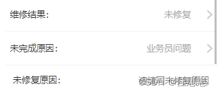 });$("#result").change(function () {var result = $("#result").val();console.log(result)if (result == "") { //请选择$("#Notrepair").hide(); //隐藏$("#notrepairDiv").hide(); //隐藏$("#Unfinished").hide(); //隐藏未完成} else if (result == "1") {$("#Notrepair").hide();$("#notrepairDiv").hide();$("#Unfinished").hide(); //隐藏未完成} else if (result == "2") {$("#Notrepair").hide();$("#notrepairDiv").hide();$("#Unfinished").hide(); //隐藏未完成} else if (result == "3") {$("#Notrepair").show();//显示$("#notrepairDiv").show();//显示$("#Unfinished").show();} else if (result == "4") {$("#Unfinished").show();$("#notrepairDiv").show();$("#Notrepair").show();//显示}});