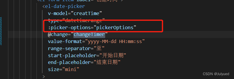 pickerOptions: {onPick: ({ end , start}) => {if (start) {this.choiceDate = start.getTime()}if (end ) {document.getElementsByClassName('el-date-range-picker__time-picker-wrap')[3].getElementsByClassName('el-input__inner')[0].value = '23:59:59'this.timeDate= ''}},}