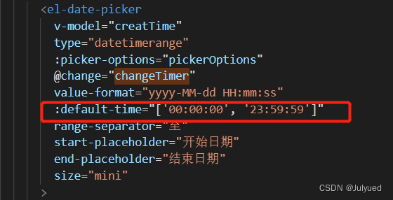 changeTimer() {let valueif (this.creatTime) {value = new Date(this.creatTime[1])if (value.getHours() === 0 && value.getMinutes() === 0 && value.getSeconds() === 0) {let year = value.getFullYear()let month = value.getMonth()let date = value.getDate()this.creatTime[1] = `${year}-${month}-${date} 23:59:59`}}}
