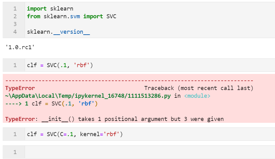 按照scikit-learn官方的说法,为了更加清楚明确地构建机器学习代码,在之后的版本中,绝大部分API都将逐渐转换为强制使用「关键词参数」,使用「位置参数」则会直接抛出TypeError错误,以SVC为例: