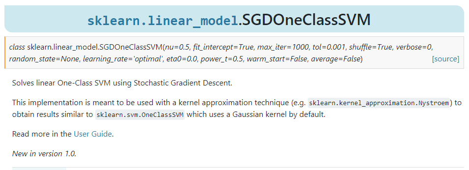 在sklearn.linear_model中新增了基于随机梯度下降法的异常检测模型SGDOneClassSVM():