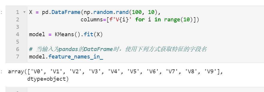 当输入的特征为pandas中的DataFrame类型时,对于训练好的模型,可以使用feature_names_in_属性获取到对应输入特征的字段名称:
