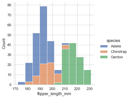 penguins = sns.load_dataset("penguins")#导入数据g = sns.displot(data=penguins,x="flipper_length_mm",hue="species",multiple="stack",kind="hist")#一行代码出图