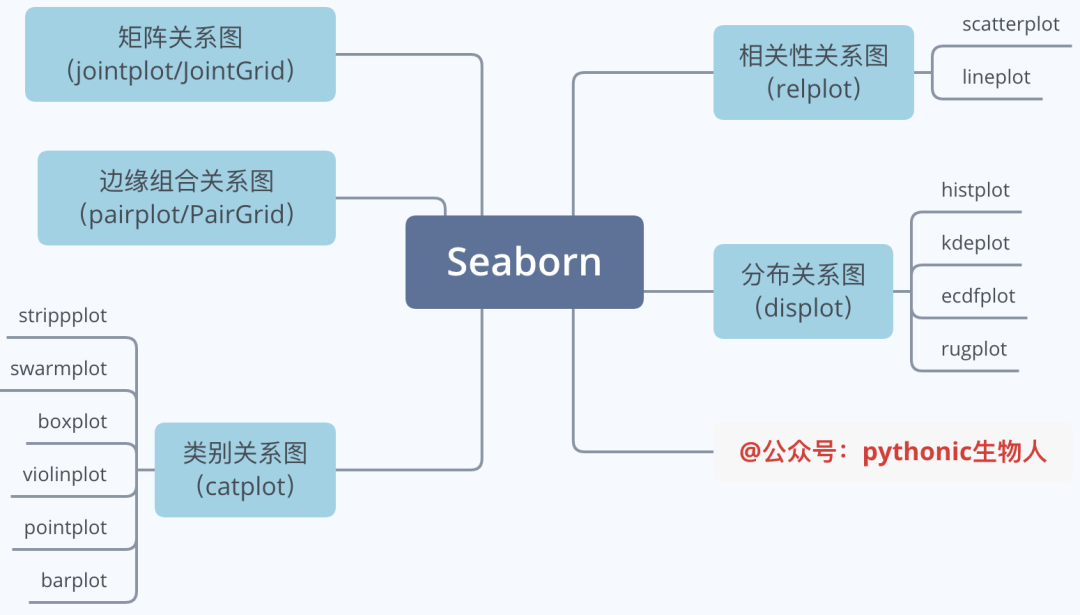Seaborn主要有两种图形实现方法Figure水平「下图绿色格子中所有方法,如jointplot、JointGrid」、Axes水平「如stripplot、swarmplot等」,本文梳理Seaborn主要结构,助快速掌控Seaborn????