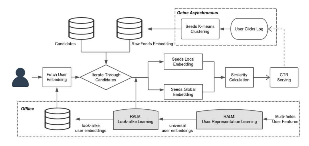 Realtime Attention-based Look-alike Model(RALM)是微信看一看团队提出的,其发表于 KDD19,其将 Attention 融入到 look-alike 方法中并用于实时资讯推荐,其系统架构如下图所示:
