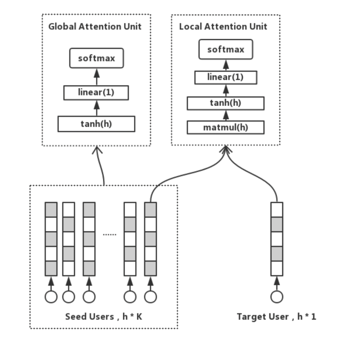 假设用户会存在自己的个性信息,同时也有群体共性信息,那么种子群体可以表示为:个性信息+共性信息。作者为此分别建模 Local Attention 和 Global Attention 学习出两种 embedding: