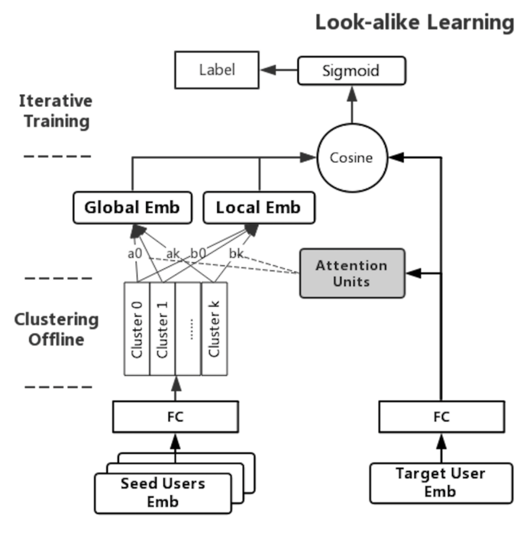 「离线训练」部分包括 User Representation Learning 和 Look-alike Learning,前者用于学习用户的特征向量,后者是基于用户特征向量计算相似分数。