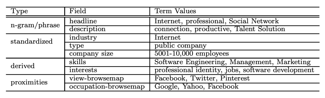 Linkedin 将每个实体建模为一个多域的结构化 doc(structured multi-fielded document),并提取四种类型的字段,包括:n-grams/词典、标准化命名的数据类型(standardized,公司名、行业名等)、派生数据类型(derived,互联网公司可以派生出网络开发、软件开发等)和相近实体(proximities,基于用户和公司交互的网络确定其他相关公司)。举个例子: