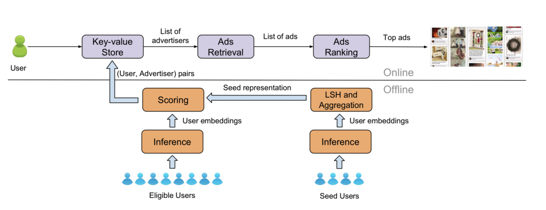 Pinterest look-alike 于 KDD 19 发表了他们的 look-alike 模型,其大致分为两部分基于 LR 的分类模型和基于 Embedding 的相似搜索的模型。