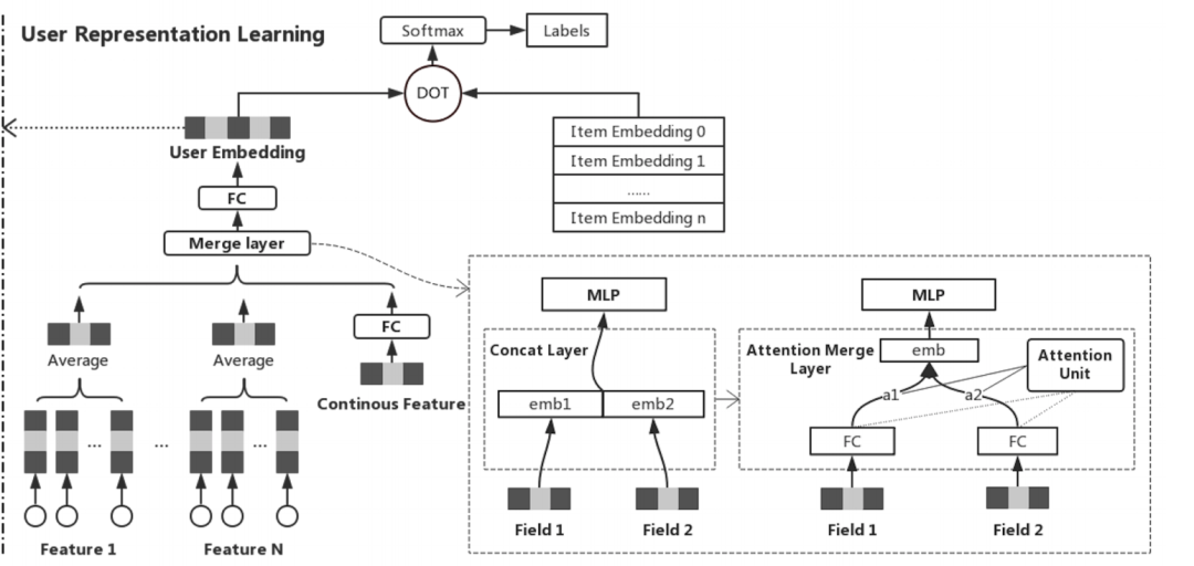 User Representation Learning 模块是基于 Youtube DNN 模型进行改进,左侧为用户特征,并用 Attention 代替 concat,左侧为 Item 特征,然后整体做 SCE Loss 或者多分类,预测用户的下一个点击,训练完成后左侧取最后一层隐层作为用户的特征向量,模型结构如下图所示: