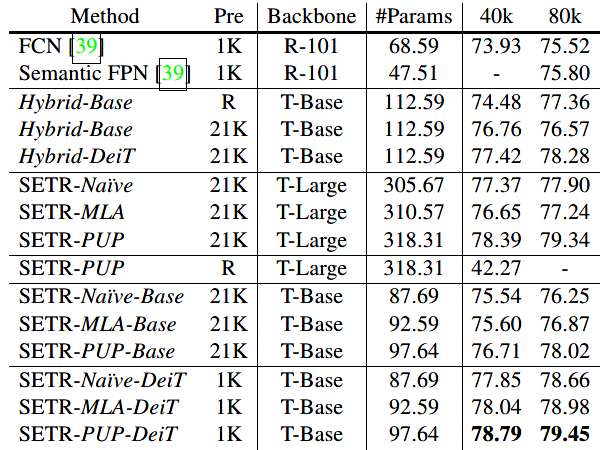 表1是基于不同预训练和backbone的SETR变体模型的参数量和效果展示。