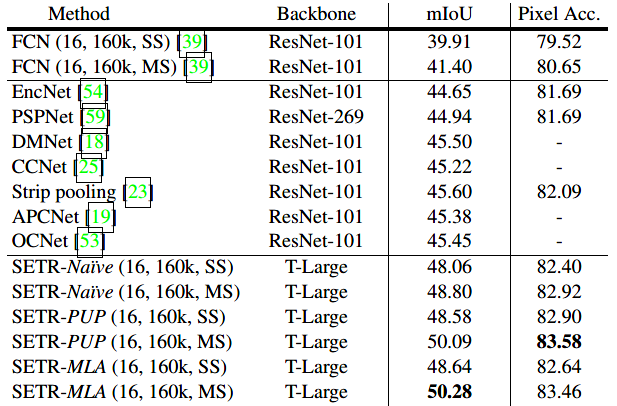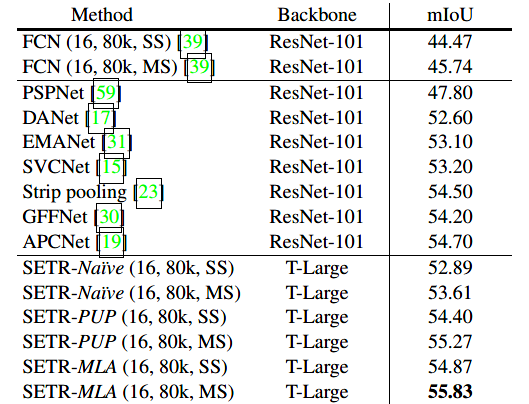 SETR在主流的语义分割数据集上都做了大量实验,包括Cityscapes、ADE20K和PASCAL Context等数据集。SETR在多个数据集上都取得了SOTA的结果,如表2和表3所示。