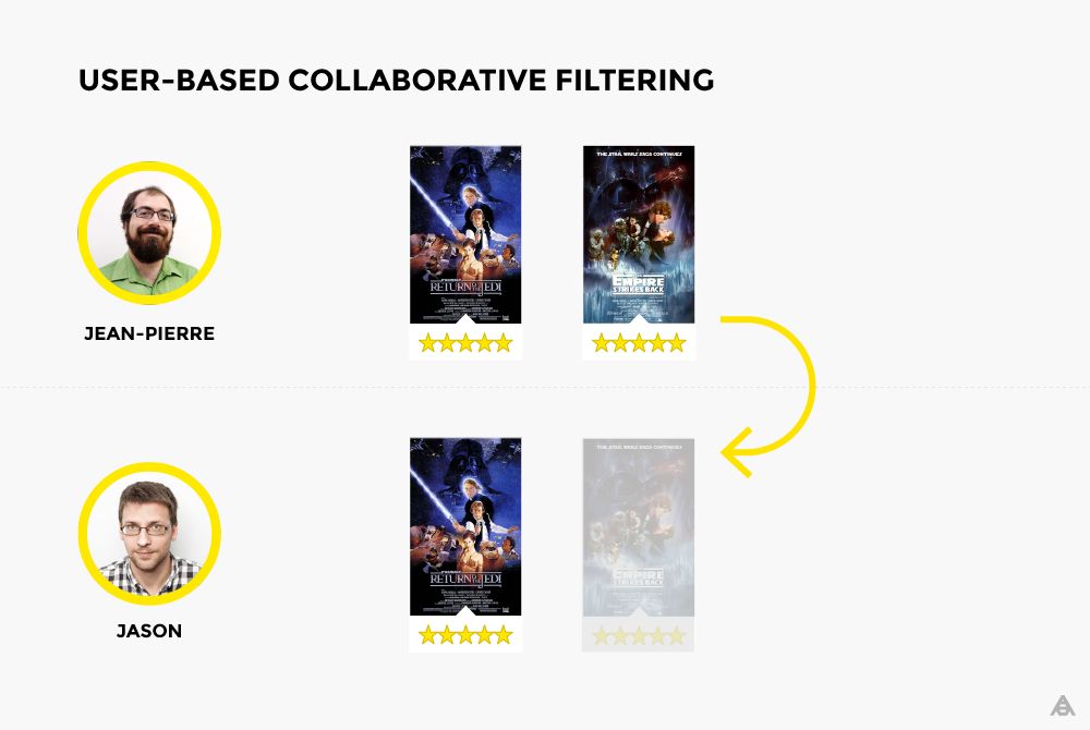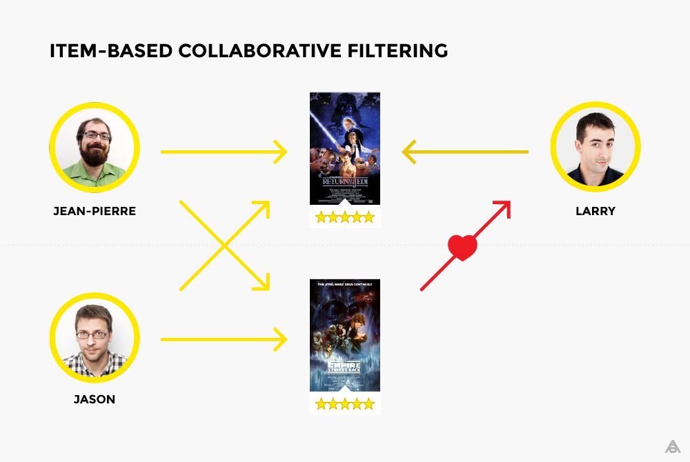基于物品的协同过滤过程很简单。两个物品的相似性基于用户给出的评分来算出。让我们回到Jean-Pierre与Jason的例子,他们两人都喜欢“绝地武士归来”和“帝国反击战”。因此,我们可以推断,喜欢第一部电影的大多数用户也可能会喜欢第二部电影。所以,对于喜欢“绝地武士归来”的第三个人Larry来说,”帝国反击战“的推荐将是有意义的。