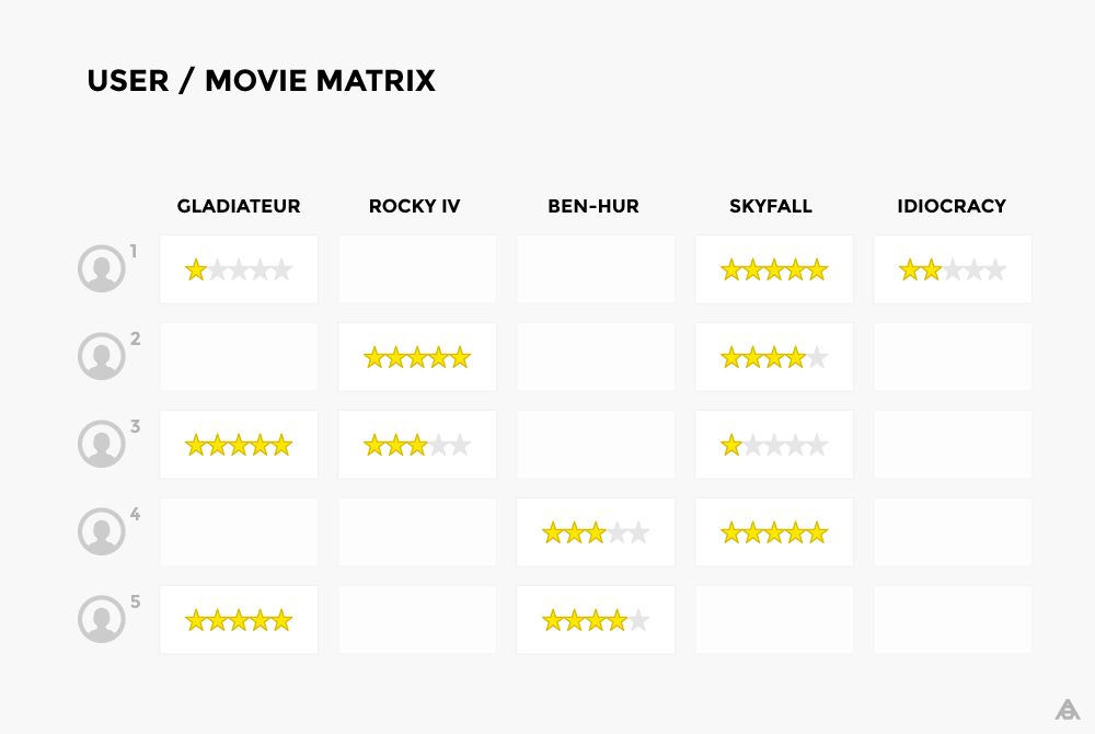 在下表中,每行代表一个用户,每列代表一部电影,只需简单地查找这个矩阵中行之间的相似度,就可以找到相似的用户了。