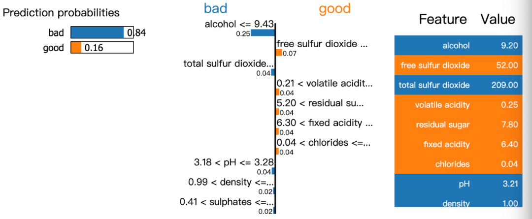 模型有84%的置信度是坏的wine,而其中alcohol,total sulfur dioxide是最重要的。