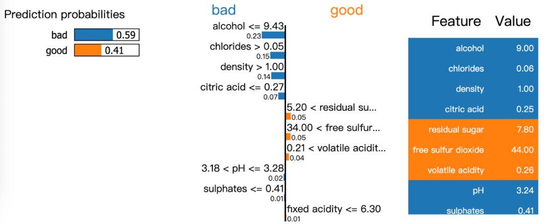 模型有59%的置信度是坏的wine,而其中alcohol,chlorides, density, citric acid是最重要的预测参考因素。
