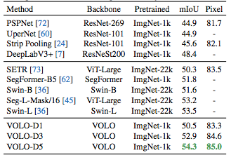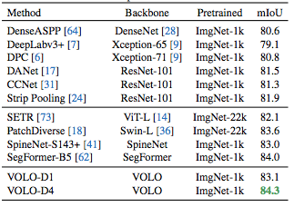 3. 无需任务额外训练数据,VOLO成为ImageNet分类任务上首个达到87.1%top1精度的模型。预训练VOLO在下游任务上的迁移能力也非常好,在语义分割任务中,在ADE20K验证集上达到了54.3%,在Cityscapes验证集上达到了84.3%的mIoU指标,均创下了新记录。