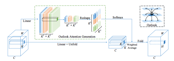 进行映射得到outlook权重, value表示,然后我们用来表示在以为中心的局部窗口的所有value:最后,在位置的outlook 权重可以直接用作注意力权值,首先可以通过一个reshape操作()后接Softmax:
