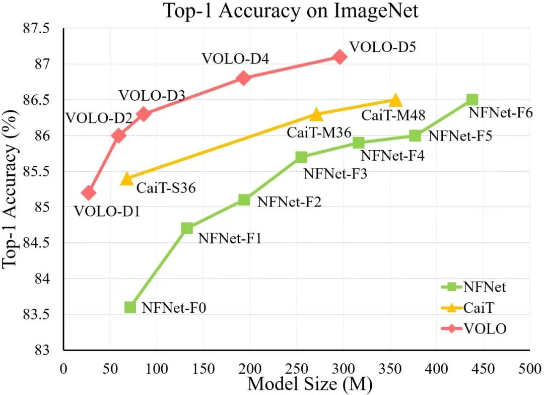 以VOLO-D1为例,它仅需26.6M参数,在224分辨率即可取得84.2%的top1精度,在384分辨率可以进一步提升到85.2%,显著优化其他同等参数量的模型;