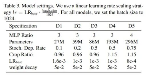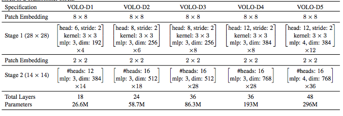 主要借鉴了LV-ViT模型,VOLO的具体设置如下:为了获取到细粒度的token表示,在第一阶段,我们首先调整patch嵌入模块,使其在大小为的小图像patch上进行标记序列化,而不是 。然后通过堆叠一系列Outlookers生成更具细粒度特征表达能力的token表示。第二阶段,利用另一个patch embedding 模块对标记进行下采样。然后采用一组Transformer block对全局信息进行编码。我们基于VOLO提出了五个版本: VOLO: VOLO-D1, VOLO-D2,VOLO-D3, VOLO-D4, and VOLO-D5. 具体详细结构及配置信息如表2,表3所示: