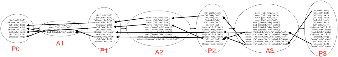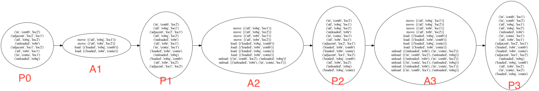 在我们的例子中,搜索从P3向后执行到P0,递归地求解目标中的所有命题。在我们解决它们之后,我们递归地使用操作的前提条件作为子目标,直到我们达到P0。
