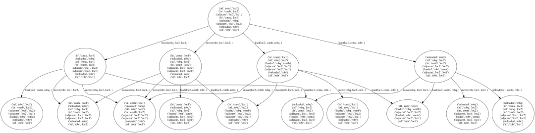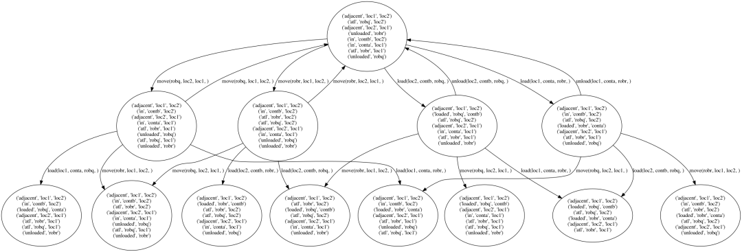 另一个区别是在可达图中,状态是一组一致的命题,而在规划图中,状态不是。例如,在图中的前提条件1中,robr的位置可以同时在loc1和loc2中。