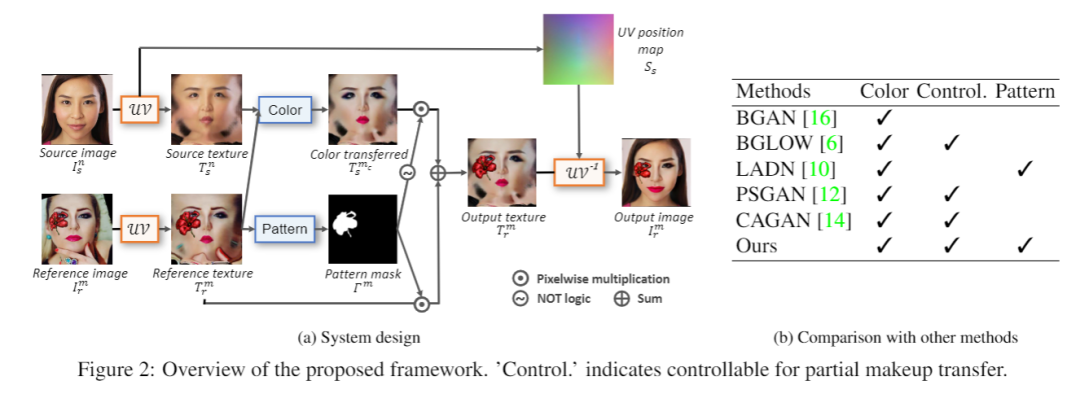 我们提出了一个与现有方法相比具有最佳灵活性的全自动妆容迁移模型。通过编辑样式代码,无需额外的计算工作,就可以轻松地实现全局/局部色调转移和去除以及阴影控制。