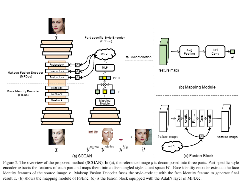 解析:提出的方法(SCGAN)的概述。在(a)中,参考图像y被分解为三部分。part-specific样式编码器提取每个部分的特征,并将其映射到一个分离的样式潜在空间W。人脸身份编码器提取源图像x的人脸身份特征。妆容融合解码器将样式码w与人脸身份特征融合,生成最终结果xˆ. (b) 显示PSEnc的映射模块(c) 是MFDec中装有AdaIN层的熔合块。