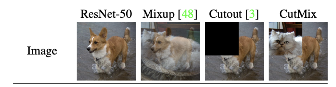 MixUp在图像领域被广泛应用,具体而言,它对两个及以上的训练样本进行插值。把两张一样大的图每个像素点按叠加,同时目标标签也按同样权重叠加,就得到了一个新的合理训练数据。除了按照像素点叠加,也可以把图A的局部用图B代替,然后按图片面积占比插值得到新类别(CutMix)。