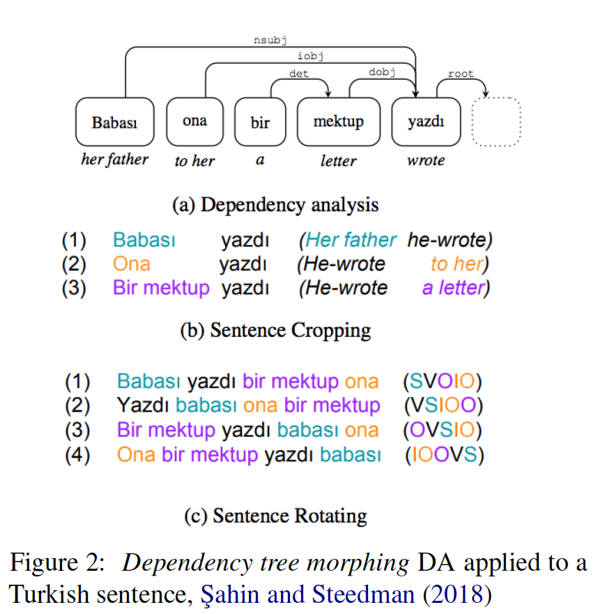 通过句法解析等技术,我们也可以讲自然语言转化成图/树的结构。因此,我们也可以通过人为设计树上的变换来获得增强数据:比如把交换子树的顺序或者删除子树等。