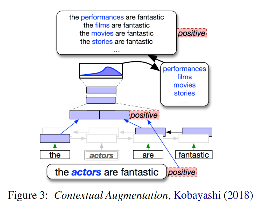 大型预训练网络获得成功之后,另外一个常见而有效的方法就是用这类模型替换原样本中的词或片段。例如随机mask上句子中的词,然后用BERT这类模型填入和原来不一样的候选词。