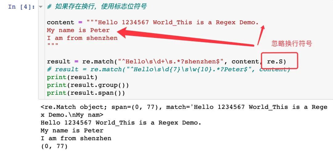 | re.S | 使 . 匹配包括换行在内的所有字符 |