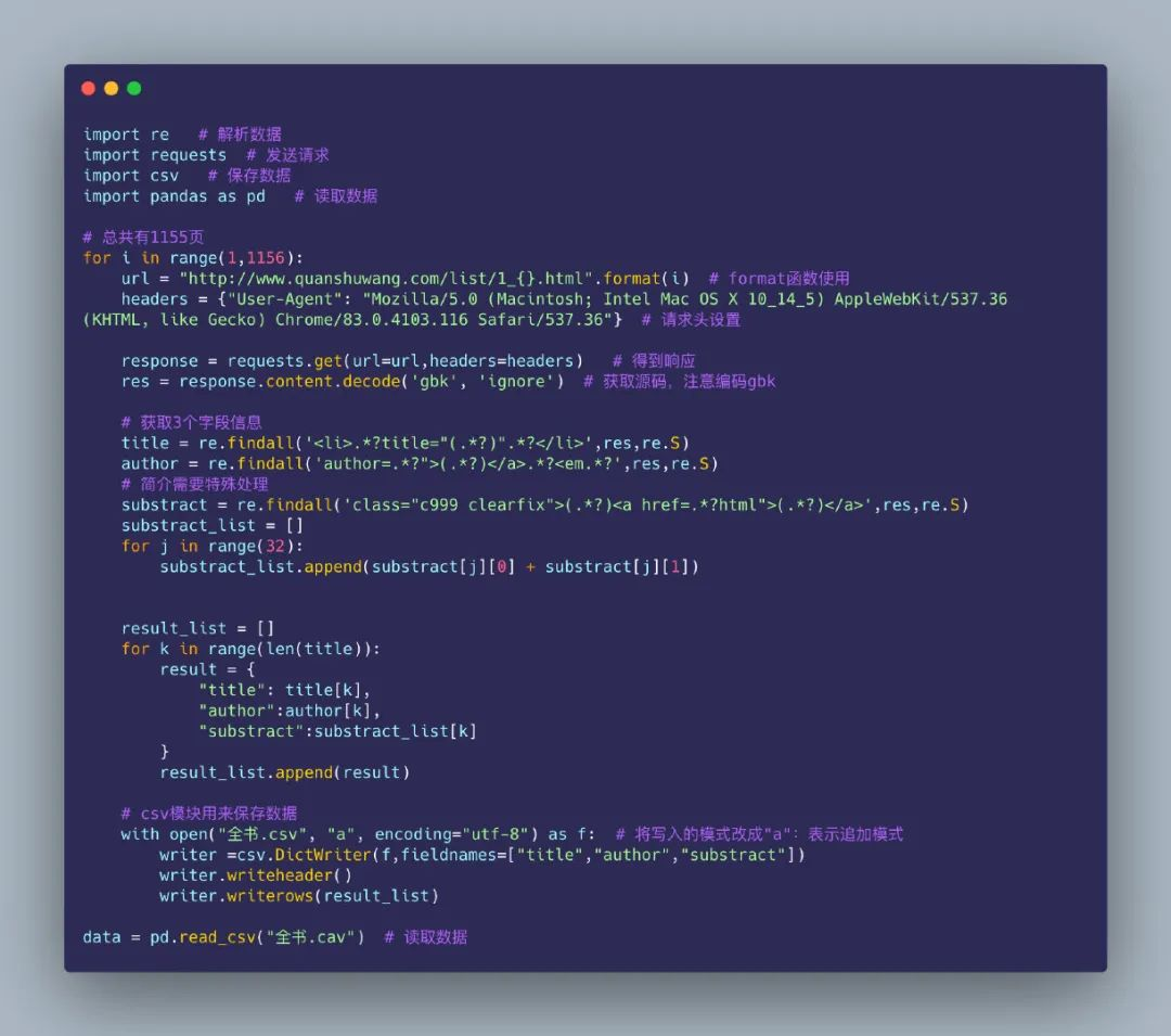 for i in range(1, 1156): # 总共1155页url = "http://www.quanshuwang.com/list/1_{}.html".format(i)