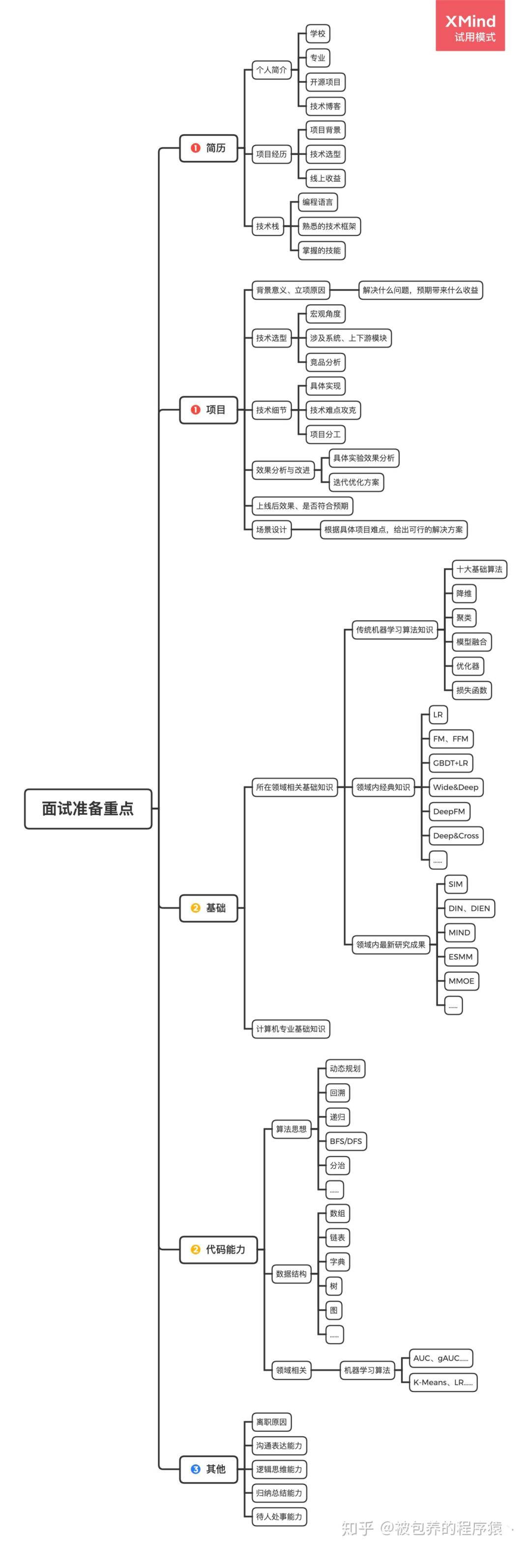 除此之外需要重点强调的就是对于你所在领域内相关基础知识的考察,比如我是做广告排序算法的,那么一些经典的广告推荐领域的排序算法要掌握,比如LR、FM、GBDT+LR这种,这种可以理解为行业的经典算法,算法细节什么的也都是要掌握的;同时对于行业内最近几年发表的最新论文也要了解一些,包括算法提出的背景是为了解决什么问题、具体算法原理思路、是否有过落地经验这种。如果上述几方面都准备的差不多了,我觉得基础这一块应该也没什么问题了