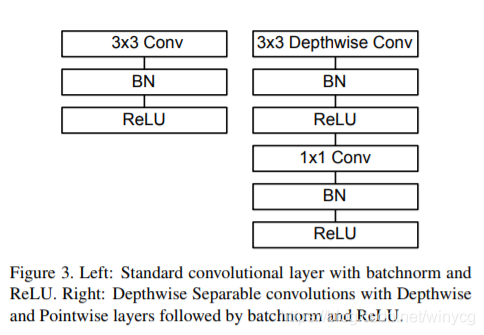 左图表示的是一般卷积过程,卷积之后跟上BN和ReLU激活层,因为DBC将分成了两个卷积过程,所以就变成了图右这种结构,Depthwise之后加上BN和ReLU,然后Pointwise之后再加上Bn和ReLU。