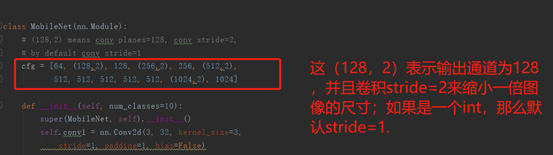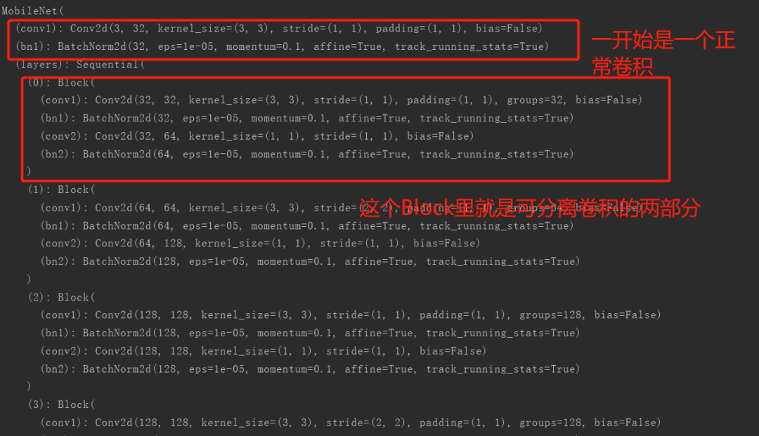 import torch.nn.functional as Fclass Block(nn.Module):'''Depthwise conv + Pointwise conv'''def __init__(self, in_planes, out_planes, stride=1):super(Block, self).__init__()self.conv1 = nn.Conv2d\(in_planes, in_planes, kernel_size=3, stride=stride, padding=1, groups=in_planes, bias=False)self.bn1 = nn.BatchNorm2d(in_planes)self.conv2 = nn.Conv2d\(in_planes, out_planes, kernel_size=1, stride=1, padding=0, bias=False)self.bn2 = nn.BatchNorm2d(out_planes)def forward(self, x):out = F.relu(self.bn1(self.conv1(x)))out = F.relu(self.bn2(self.conv2(out)))return outclass MobileNet(nn.Module):# (128,2) means conv planes=128, conv stride=2, # by default conv stride=1cfg = [64, (128,2), 128, (256,2), 256, (512,2), 512, 512, 512, 512, 512, (1024,2), 1024]def __init__(self, num_classes=10):super(MobileNet, self).__init__()self.conv1 = nn.Conv2d(3, 32, kernel_size=3, stride=1, padding=1, bias=False)self.bn1 = nn.BatchNorm2d(32)self.layers = self._make_layers(in_planes=32)self.linear = nn.Linear(1024, num_classes)def _make_layers(self, in_planes):layers = []for x in self.cfg:out_planes = x if isinstance(x, int) else x[0]stride = 1 if isinstance(x, int) else x[1]layers.append(Block(in_planes, out_planes, stride))in_planes = out_planesreturn nn.Sequential(*layers)def forward(self, x):out = F.relu(self.bn1(self.conv1(x)))out = self.layers(out)out = F.avg_pool2d(out, 2)out = out.view(out.size(0), -1)out = self.linear(out)return outnet = MobileNet()