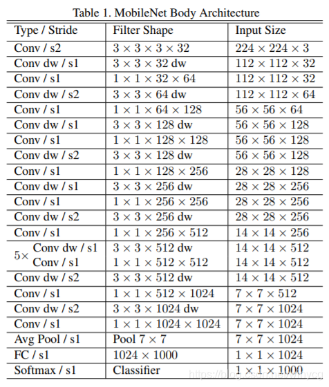 除了第一层为标准的卷积层之外,其他的层都为深度可分离卷积。