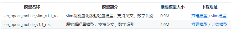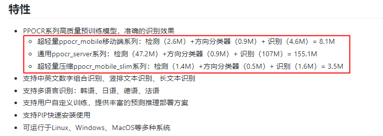 预训练模型大小:easyOCR目前暂无超轻量模型,chineseocr_lite最新的模型是4.7M左右,而PaddleOCR提供的3.5M无疑是目前业界已知最轻量的。