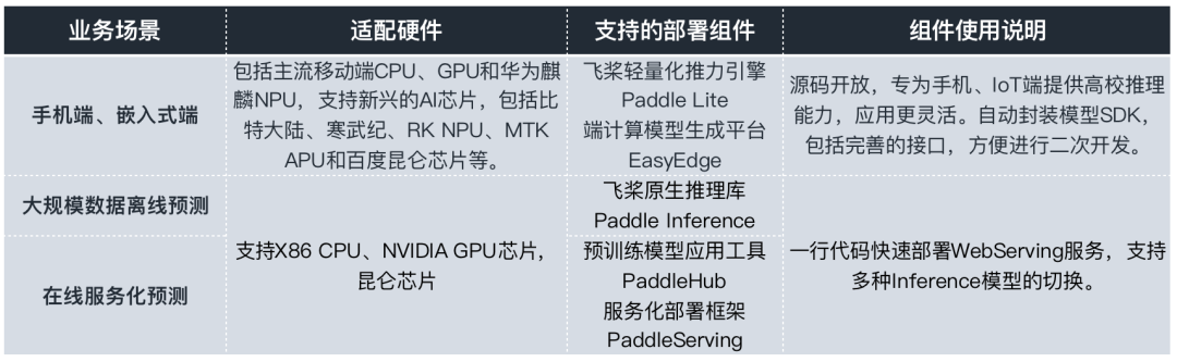 除了贴心的自定义训练,满足开发者产业级训练的需求之外,百度PaddleOCR为了更好的方便开发者和企业应用,打造了一系列的模型部署组件,可以支持开发者和企业在服务端、移动端、嵌入式硬件,云端服务化等多个不同的硬件平台部署,最大化地满足OCR文字识别领域的企业应用。