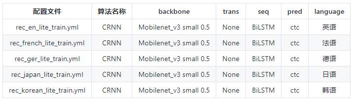 2、多语言支持,中、英、德、法、韩、日,据了解还在持续迭代更新并扩充中,欢迎体验。PaddleOCR也提供了多语言的识别模型配置文件如下图所示: