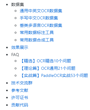 3、文档教程,绝对是开源界的一股清流,对于OCR方向,能想到的内容,PaddleOCR应该都覆盖了吧。其中的FAQ部分强烈推荐,面试OCR算法工程师岗位你应该用的到。