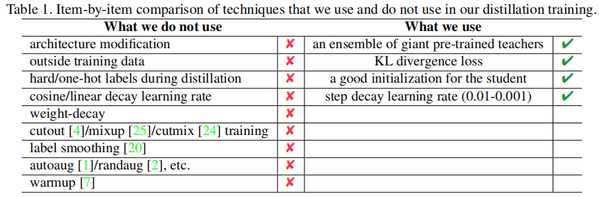 提升模型精度的trick一般包含这样几点:(1) 更好的数据增广方法,比如Mixup、Cutmix、AutoAug、RandAug、Fix resolution discrepancy等;(2) 网络架构的调整,比如SENet、ResNeSt之于ResNet;(3)更好的学习率调整机制,比如cosine;(4)额外的训练数据;(5) 知识蒸馏。而本文则聚焦于采用知识蒸馏(teacher-student)的方法提升标准ResNet50的精度。该文所用方法具有这样几点优势(与已有方法的对比见下表):